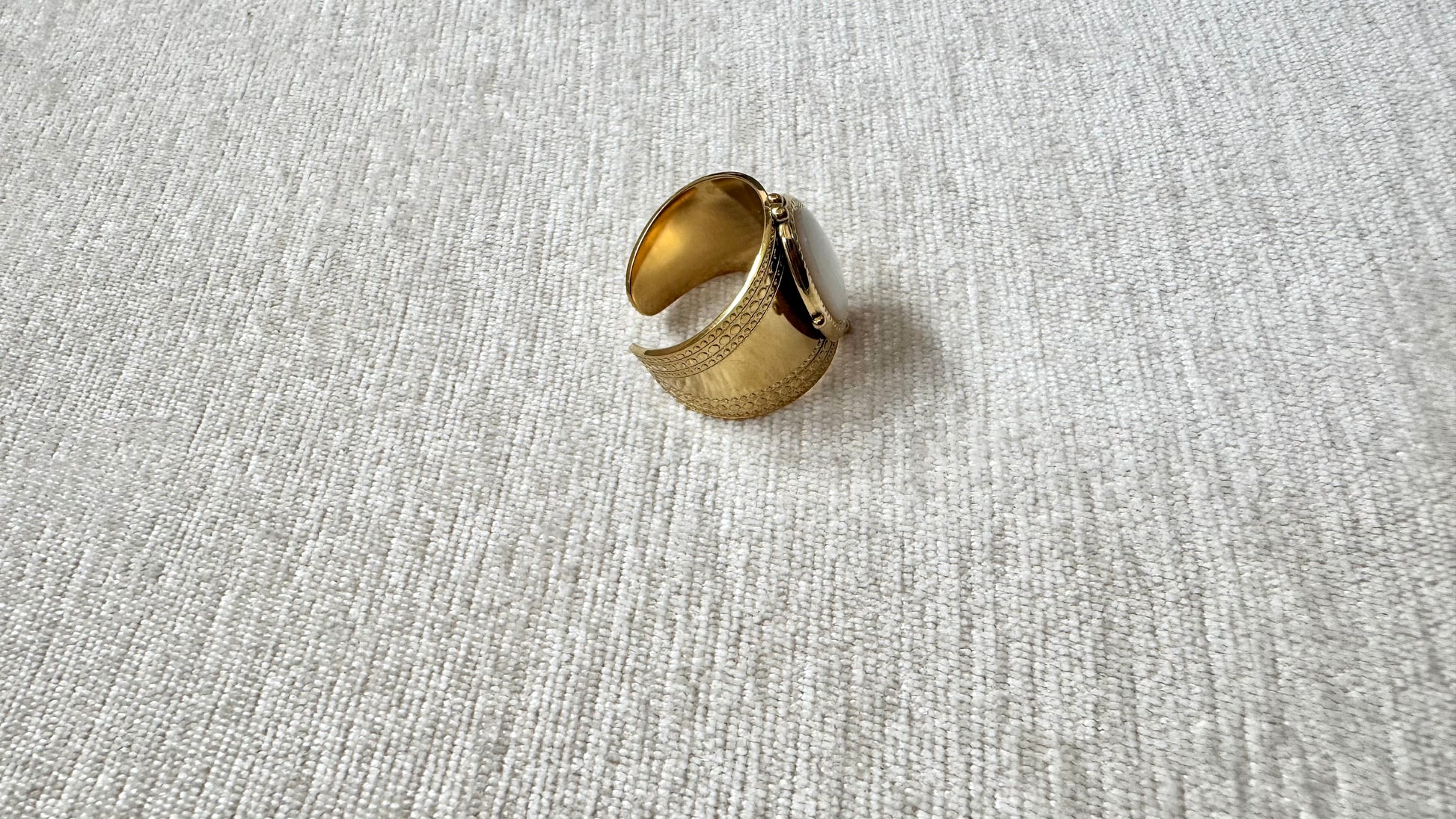 Elevate your look with this stunning adjustable ring, crafted from durable stainless steel and set with a luminous white natural stone. Designed to be both modern and timeless, this ring features intricate detailing that gives it a cultural edge while still feeling effortlessly chic.