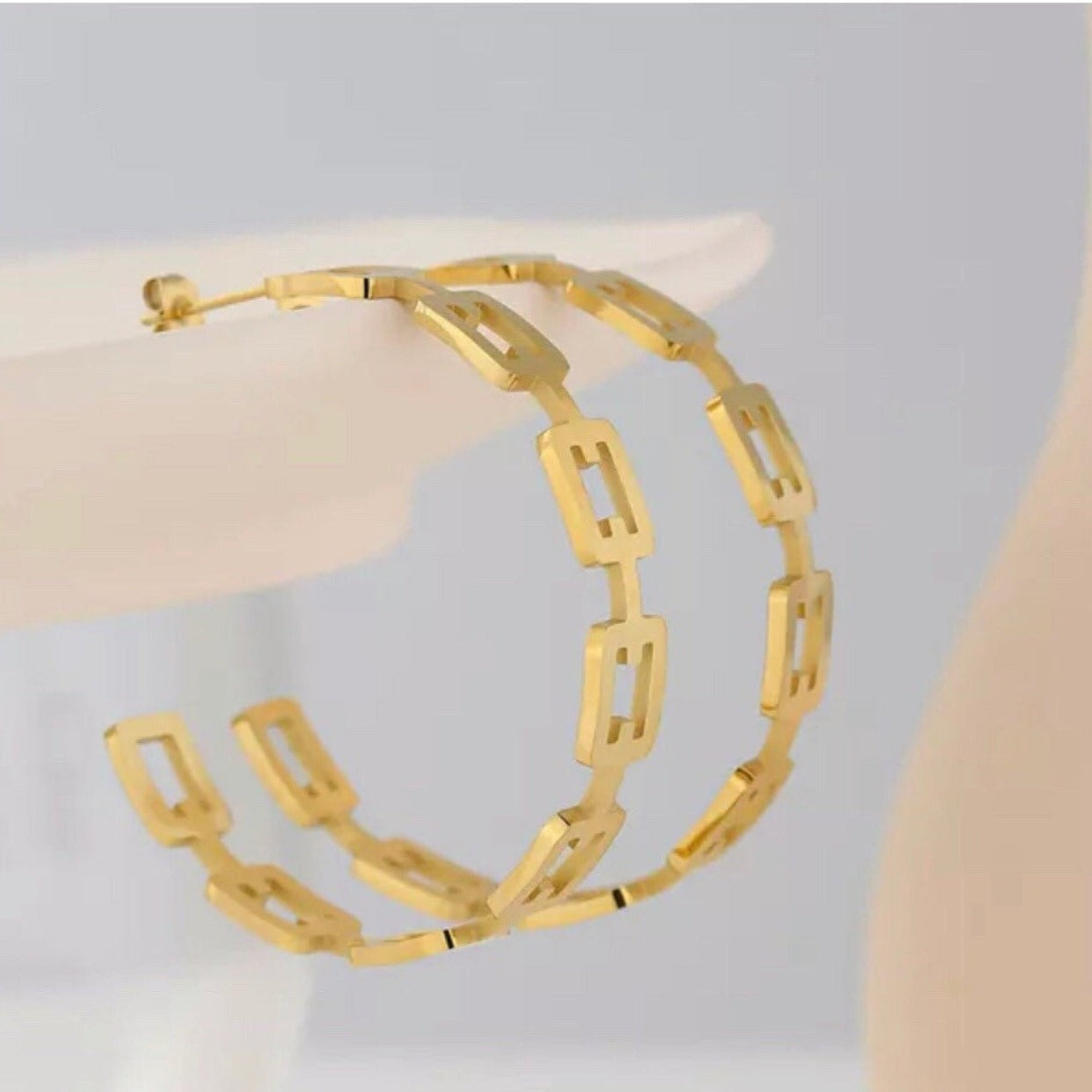 These stainless steel Chainlink Hoops are a stylish addition to any outfit! With their unique chain-link design, these hoops add a touch of edge and trendiness. Elevate your accessory game and stand out from the crowd with these must-have hoops.