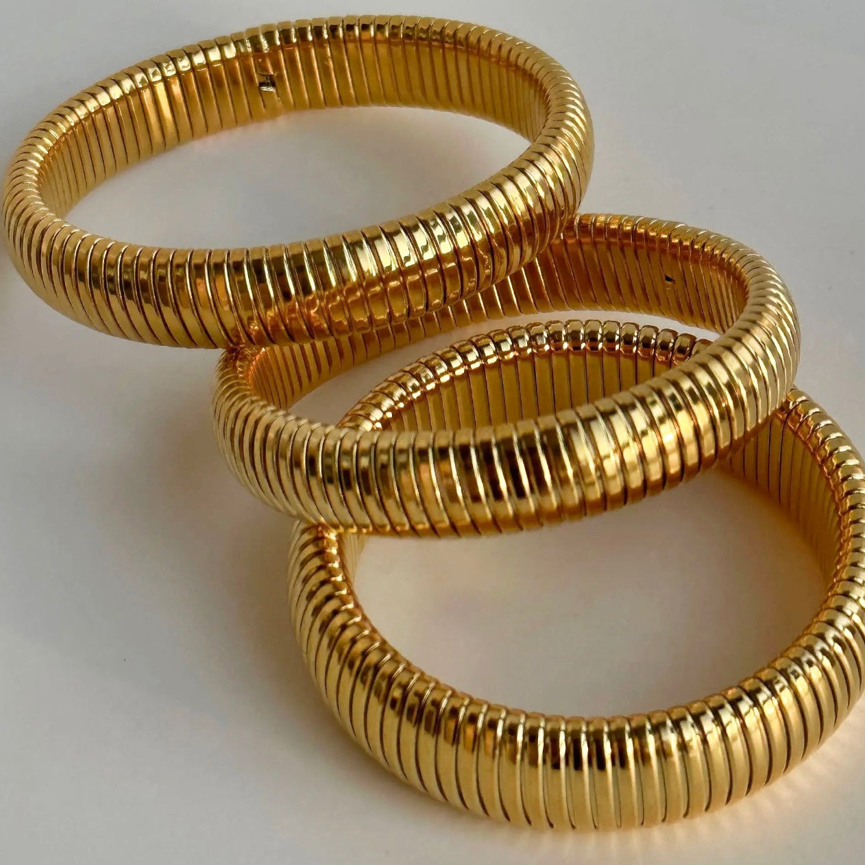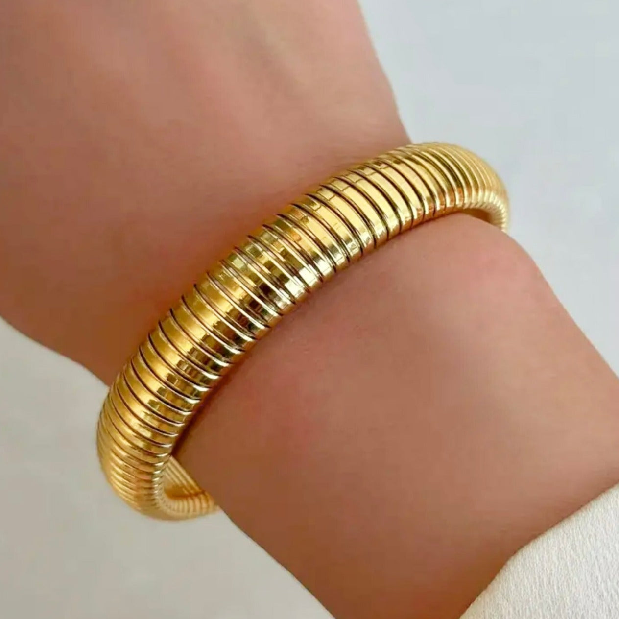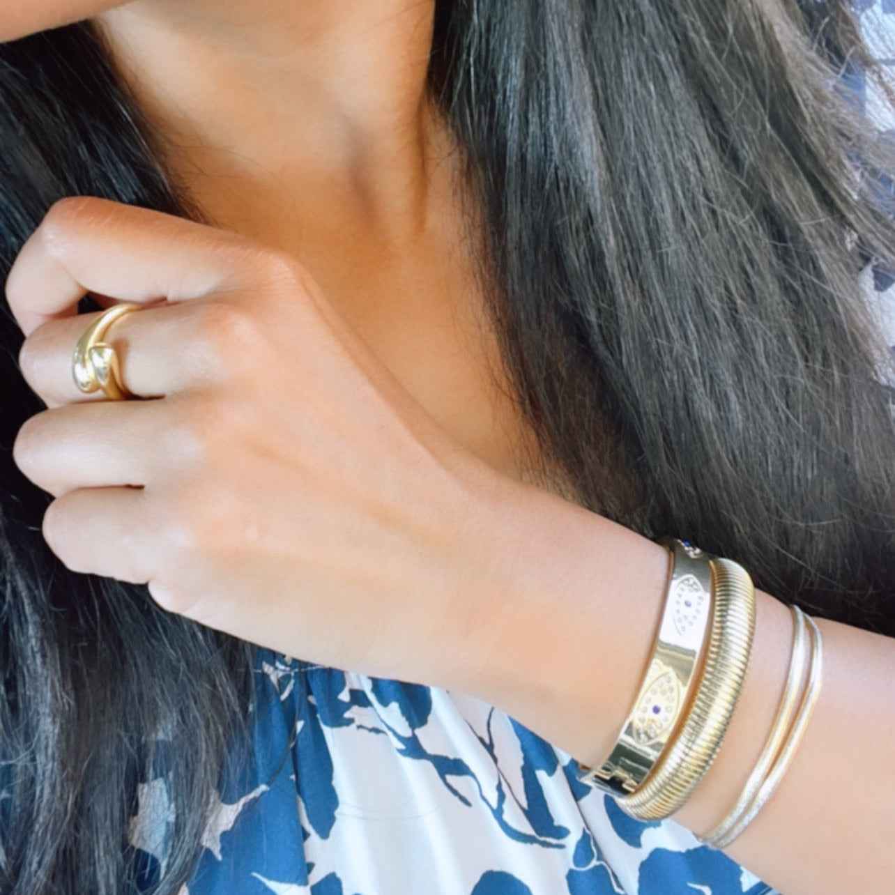 Unleash your wild side with the Cobra Bangle, a vintage-inspired slip on bracelet that adds an adventurous flair to any outfit. Made with stretchy elastic, this bold bangle is as comfortable as it is stylish. Don't be afraid to take a risk and add the Cobra Bangle to your collection today!