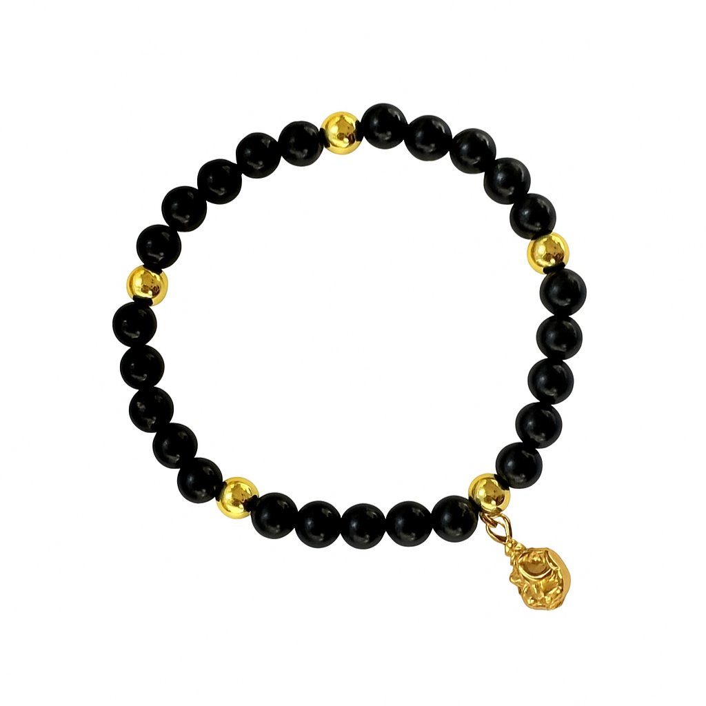 Ground yourself in strength and divine guidance with our Ganesh Wisdom Bracelet, made with Black Jasper beads and gold stainless steel accents, finished with a stainless steel, non-tarnish Ganesh charm.