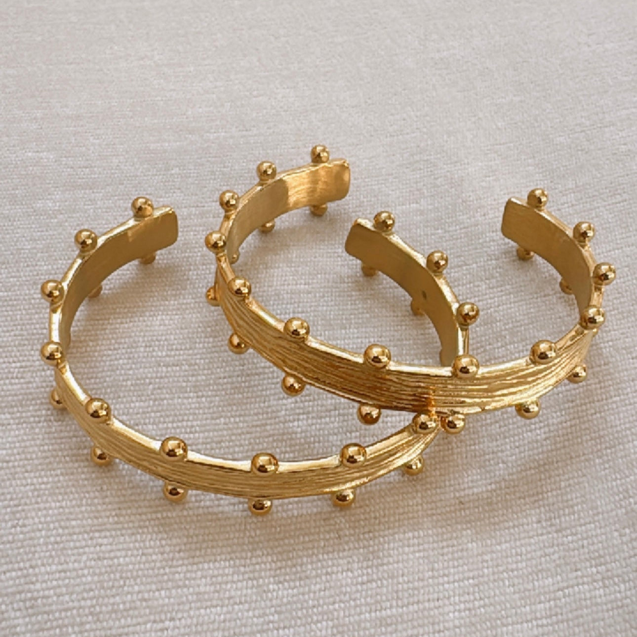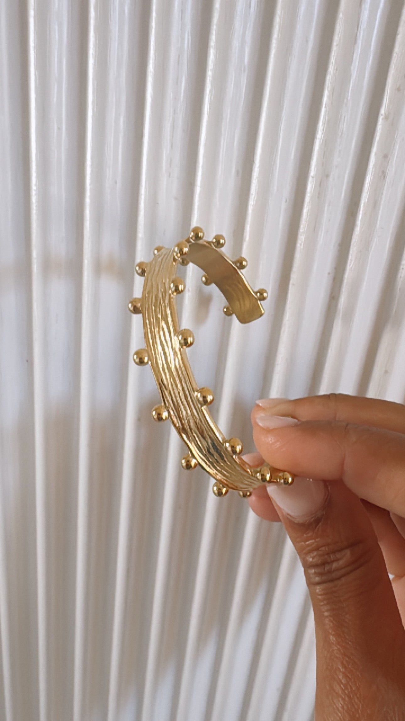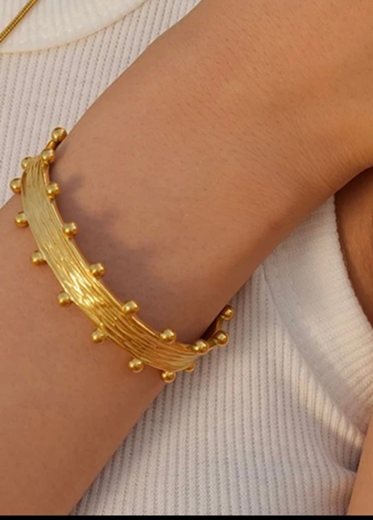 Elevate your everyday look with this stunning gold bangle, designed with a modern textured finish and dotted detailing for a bold yet elegant touch. Perfect for stacking or wearing solo, this piece is versatile enough to take you from day to night.