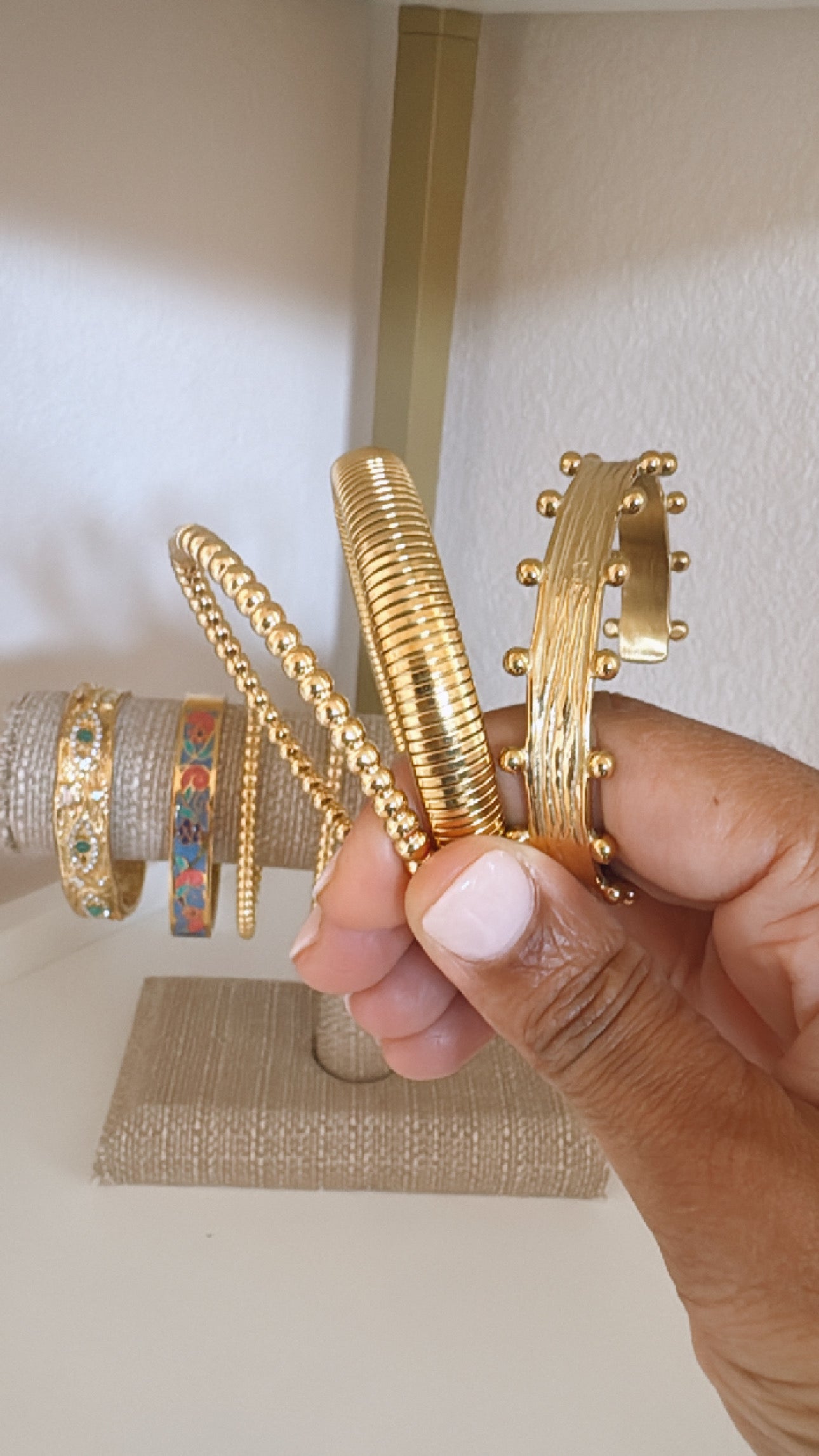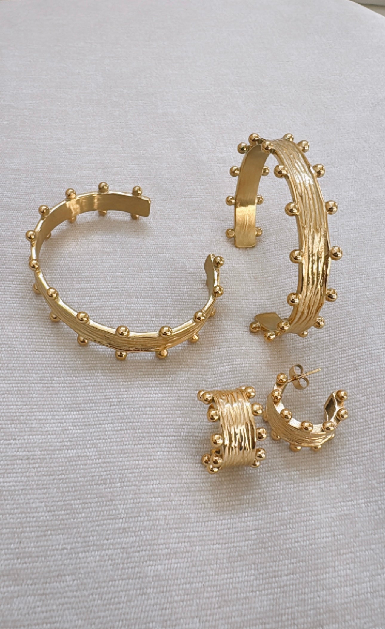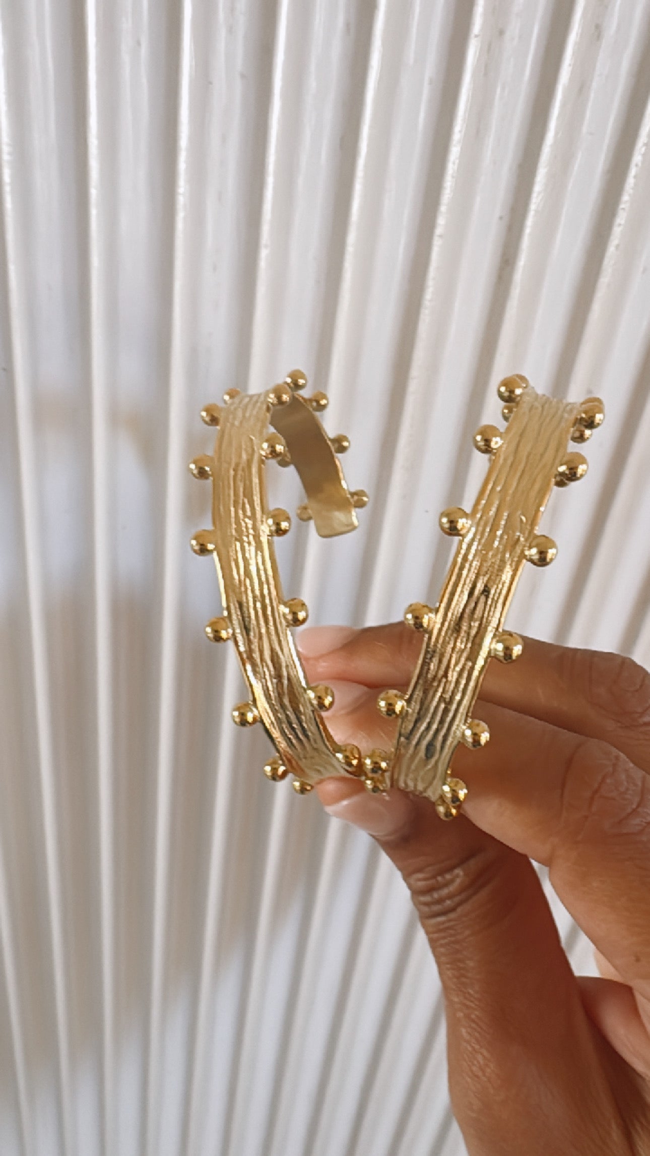 Elevate your everyday look with this stunning gold bangle, designed with a modern textured finish and dotted detailing for a bold yet elegant touch. Perfect for stacking or wearing solo, this piece is versatile enough to take you from day to night.