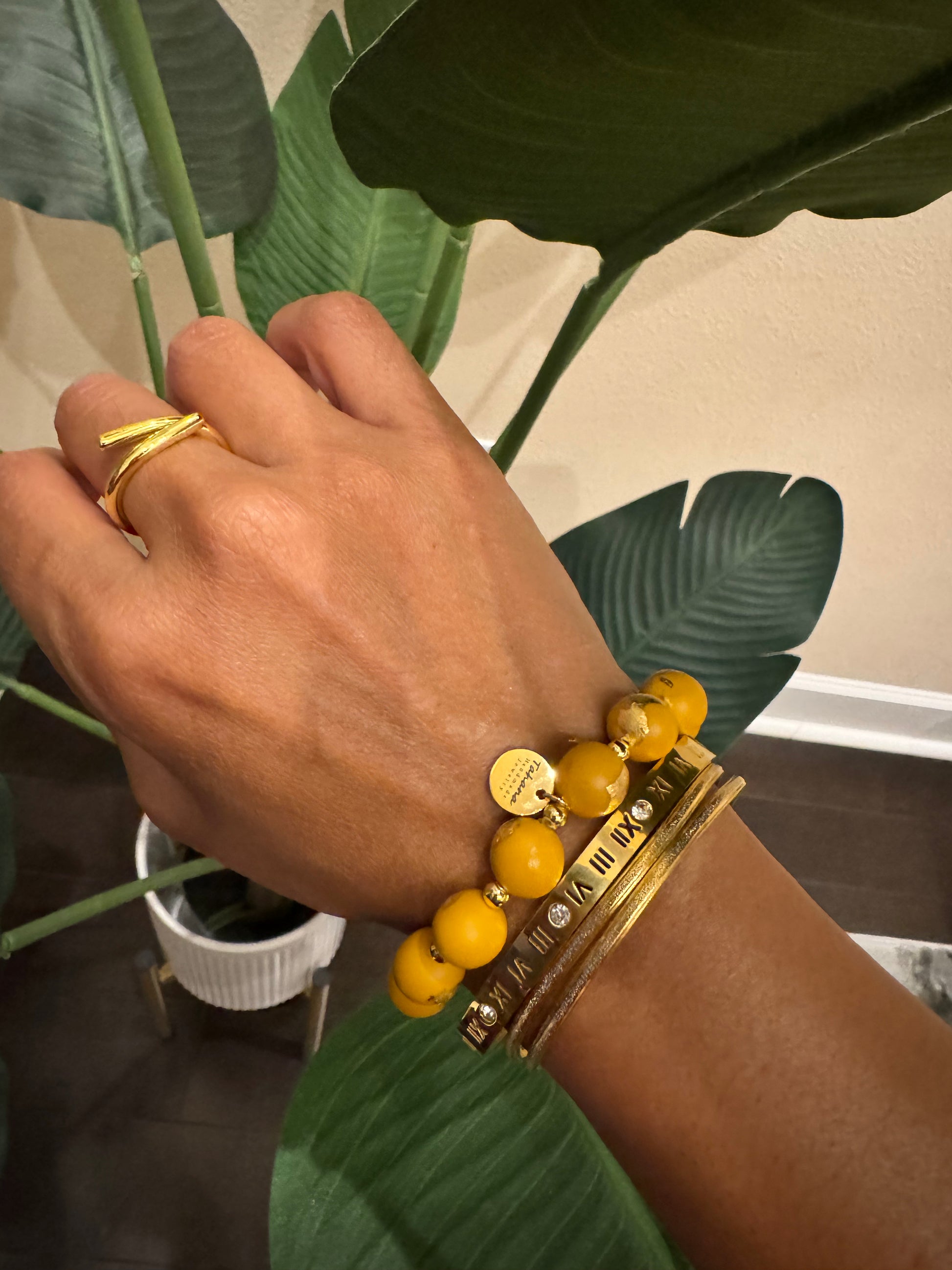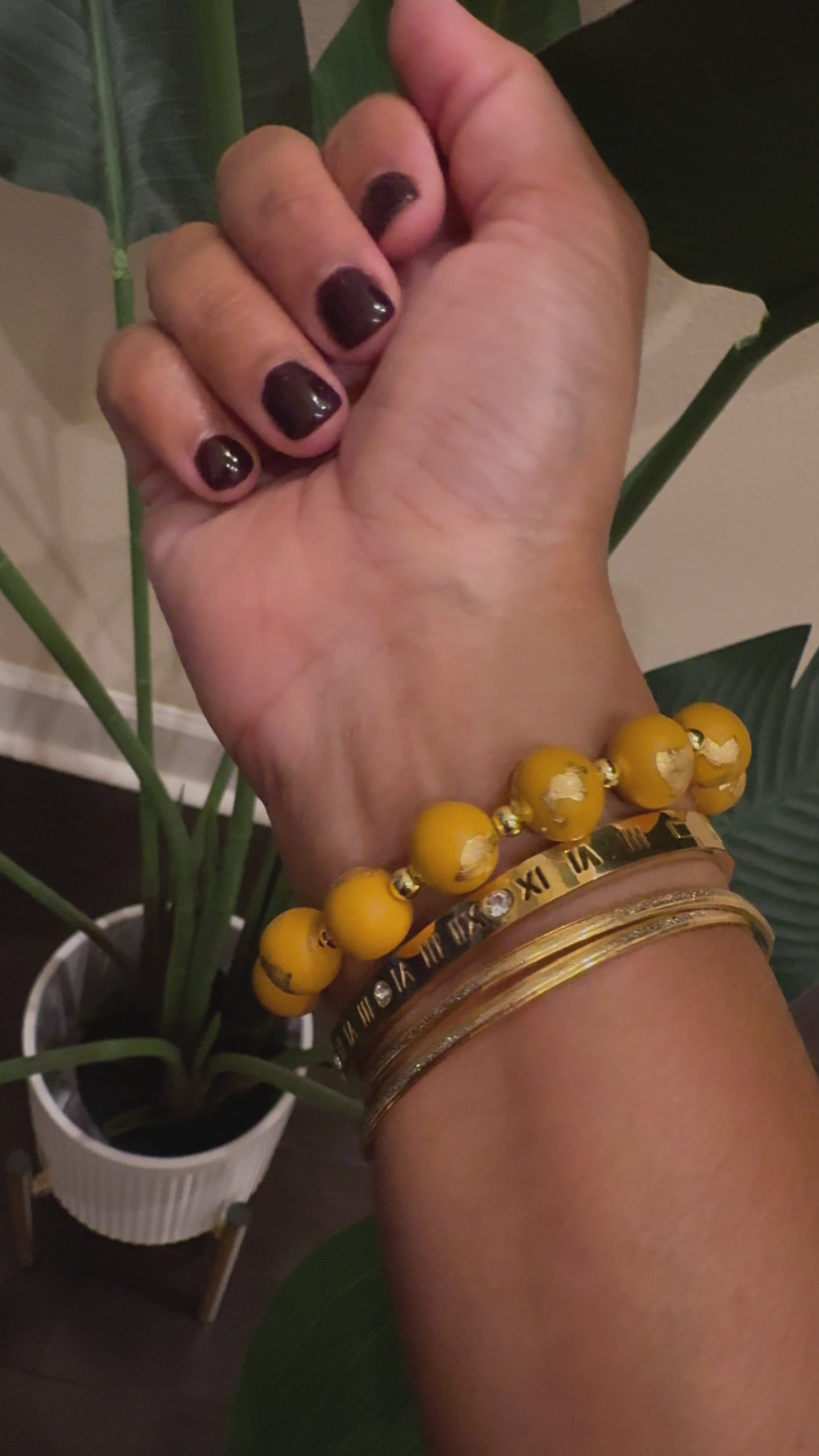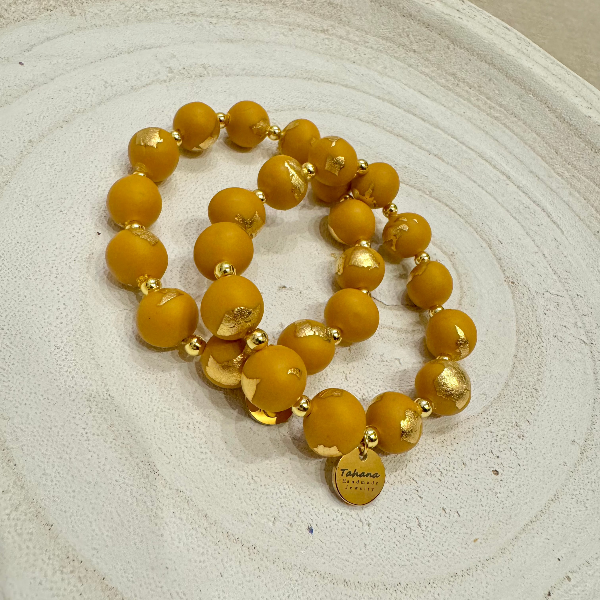 Add a touch of vibrancy to your Fall wardrobe with our Handmade Clay Bracelet in Gold + Mustard. Each bracelet is carefully handcrafted, ensuring unique and beautiful detailing. The mustard color adds a pop of color while the gold accents bring a touch of elegance. Perfect for any occasion!