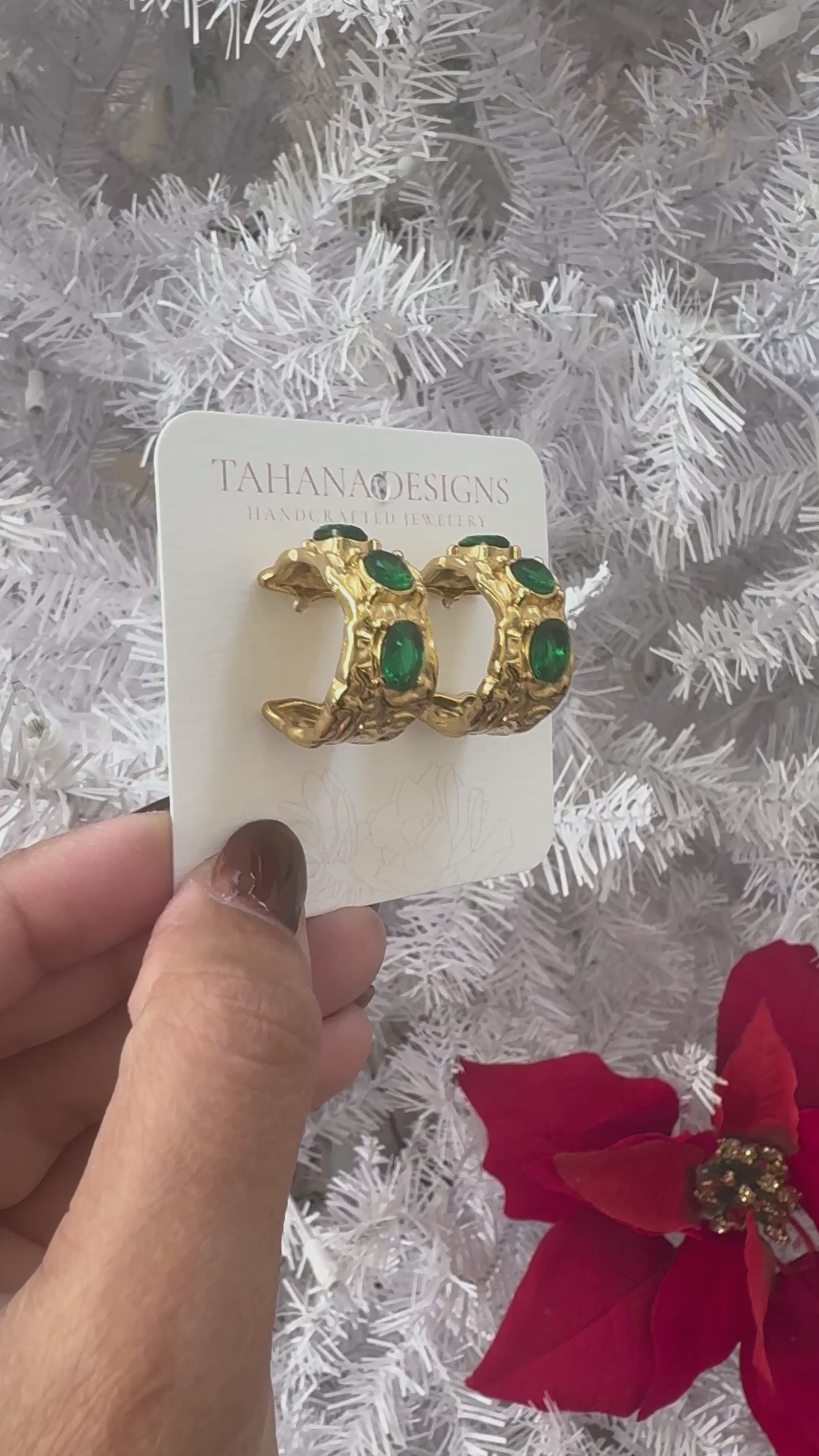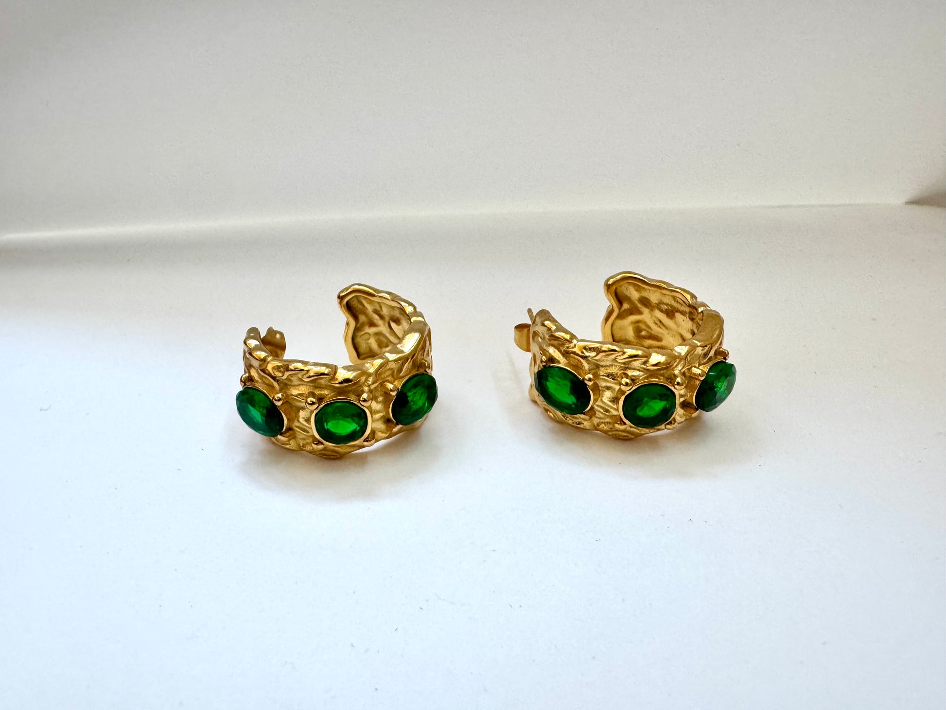 Crafted from high-quality stainless steel, these hoops are tarnish-resistant, lightweight, and perfect for everyday wear or special occasions. Their sculpted gold detailing adds an artisanal touch, while the deep green stones bring an aura of prosperity, beauty, and grace.