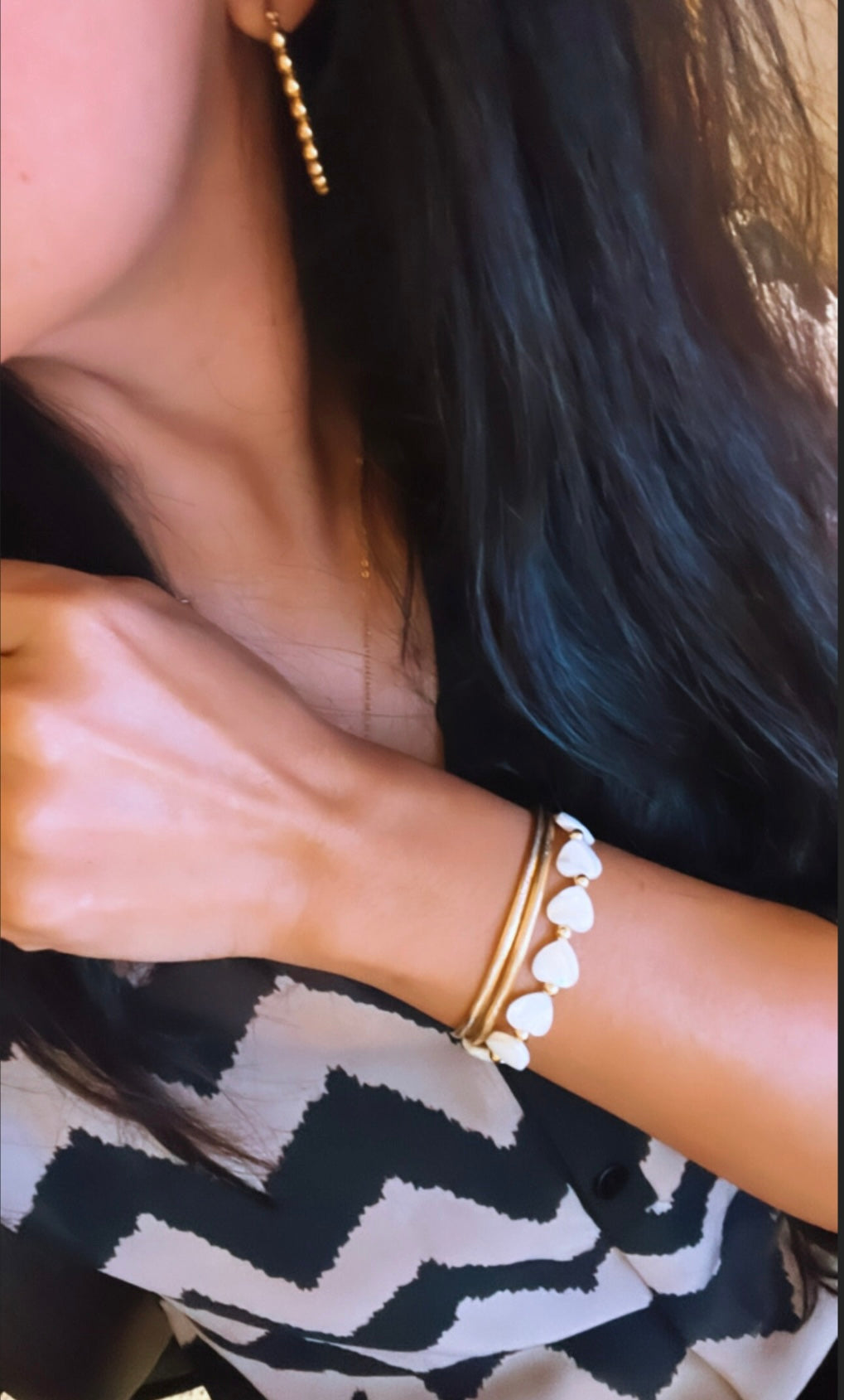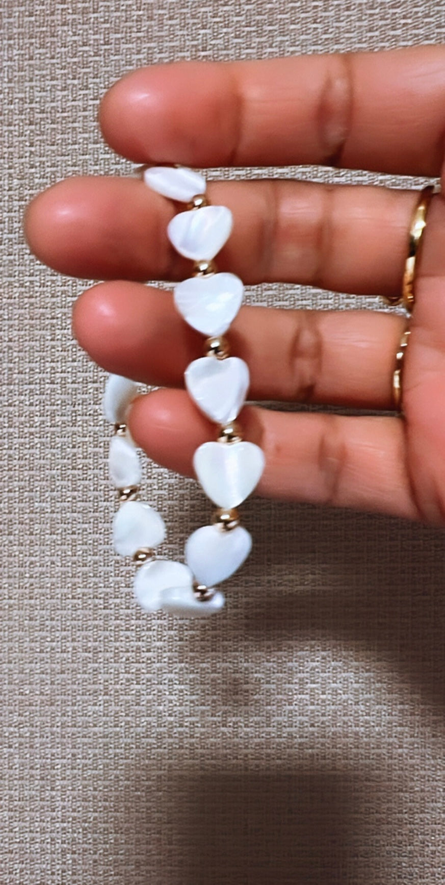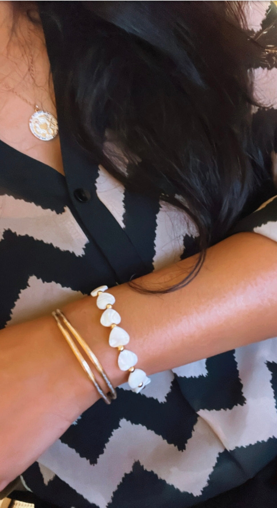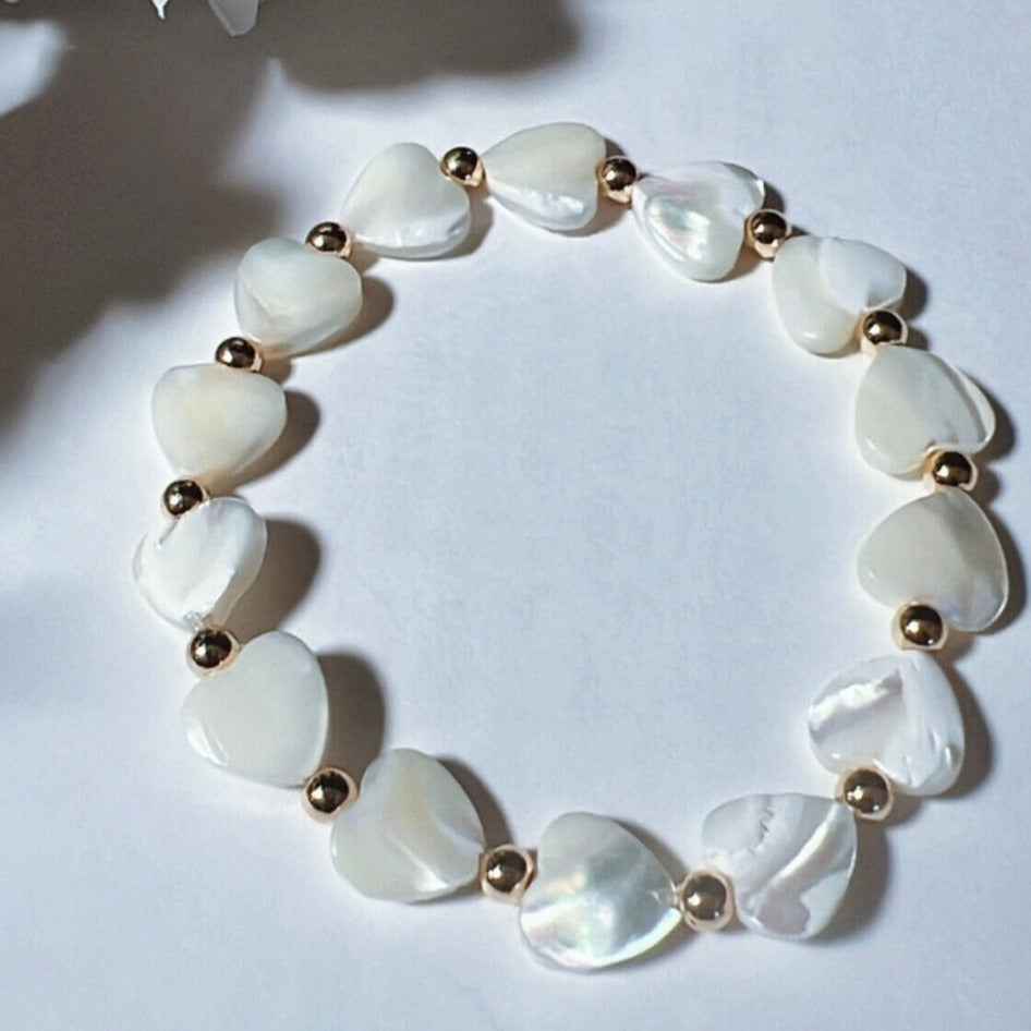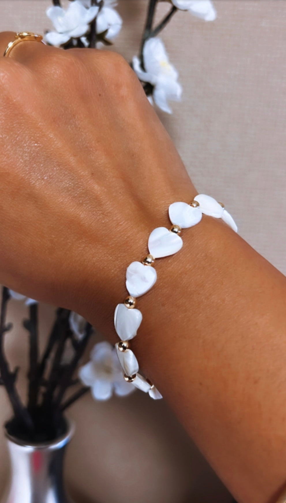 Beaded stretch bracelet, 4 mm gold beads in between pearl hearts.