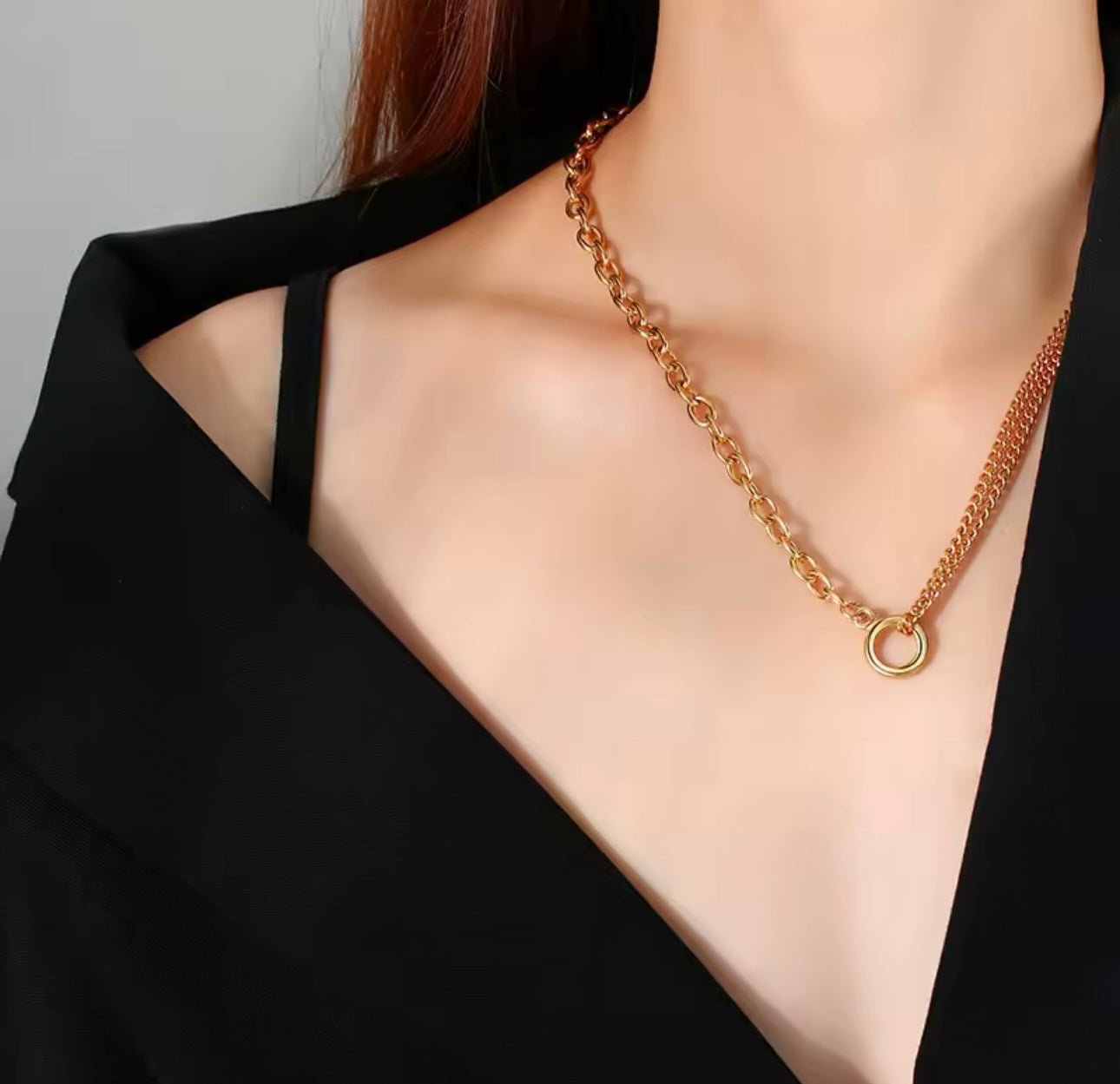 This stainless steel necklace features two sides, double chains + links. Its length of 18 inches with a 2-inch extender provides you with the perfect fit. With its modern design, this necklace is the perfect accessory for any outfit, adding an extra touch of elegance and edginess.