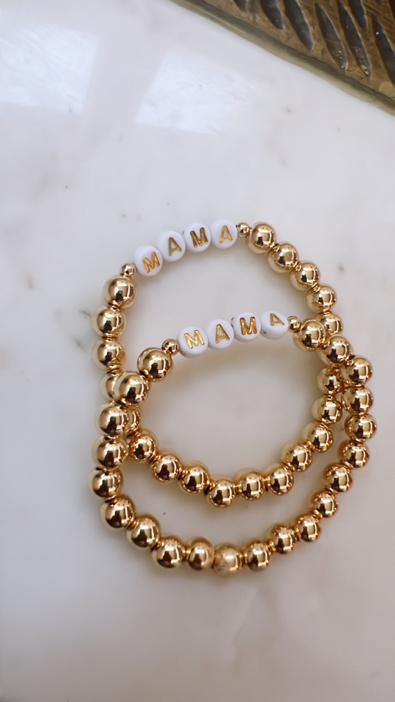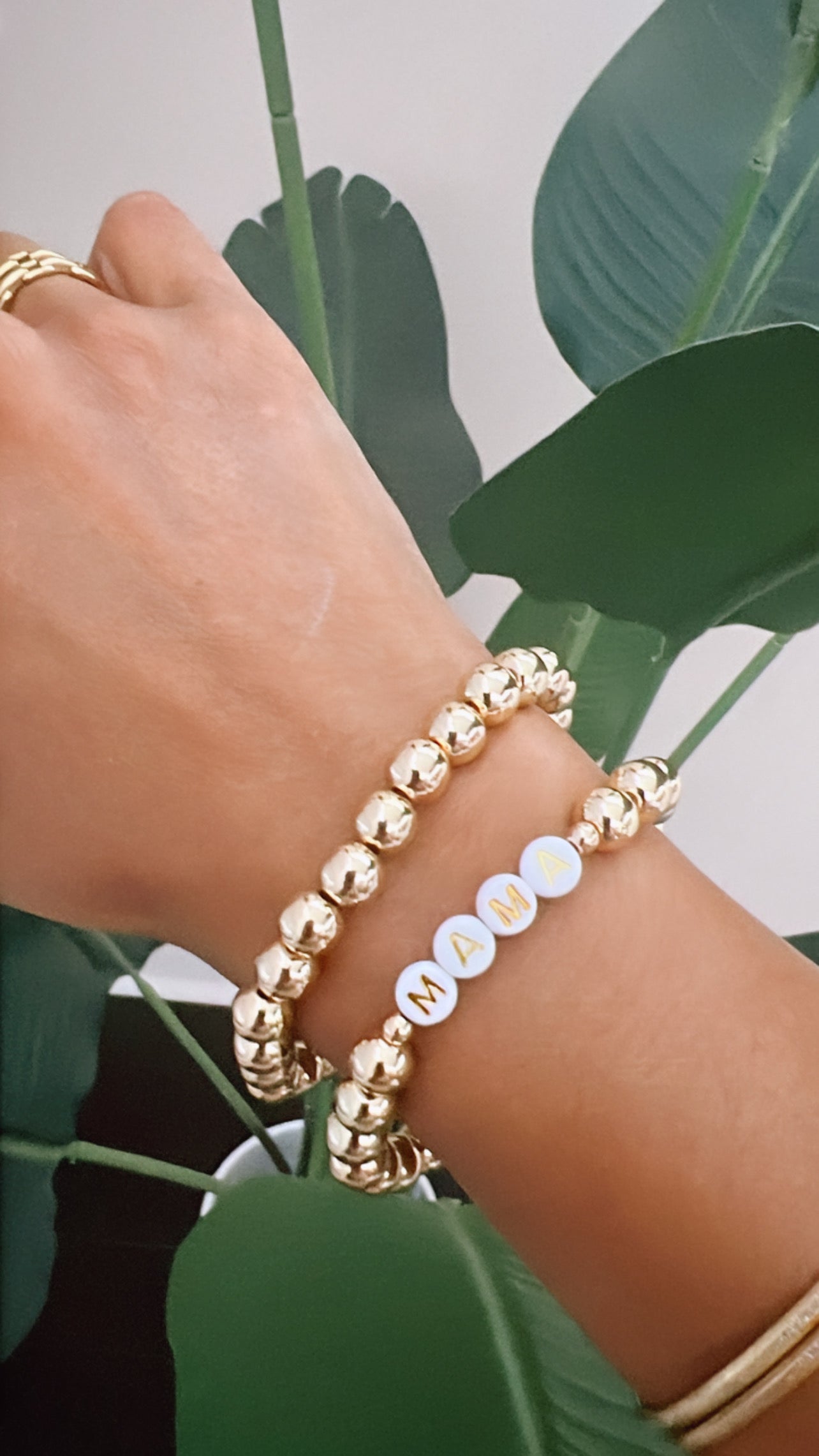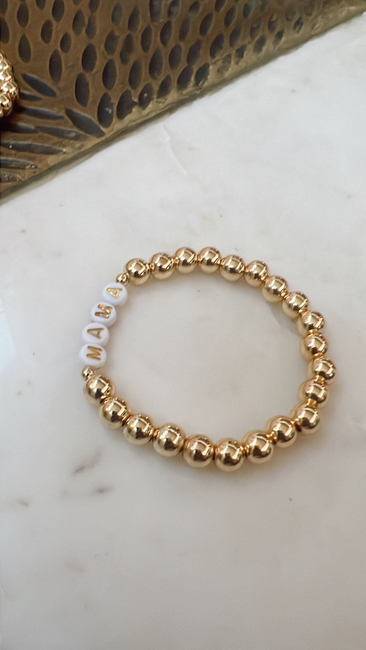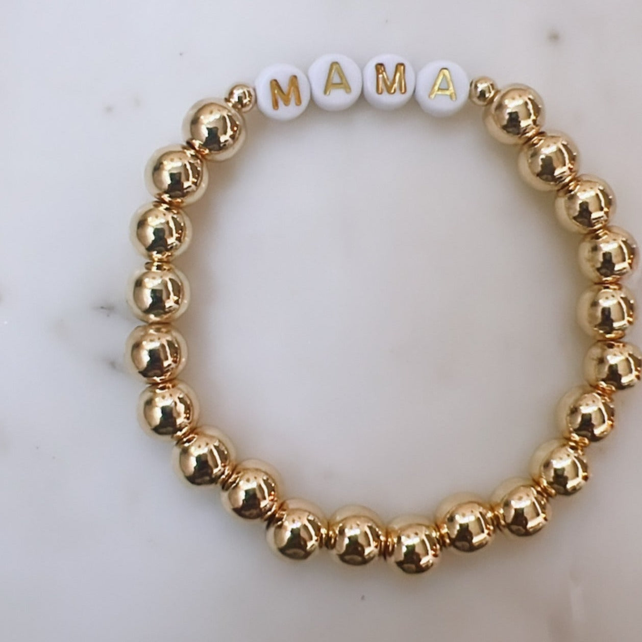 This gold "mama" bracelet is a beautiful way to show off your love for motherhood. A perfect gift for any mom, this bracelet is both stylish and sentimental. With a playful and elegant design, it's a must-have accessory for any mama.