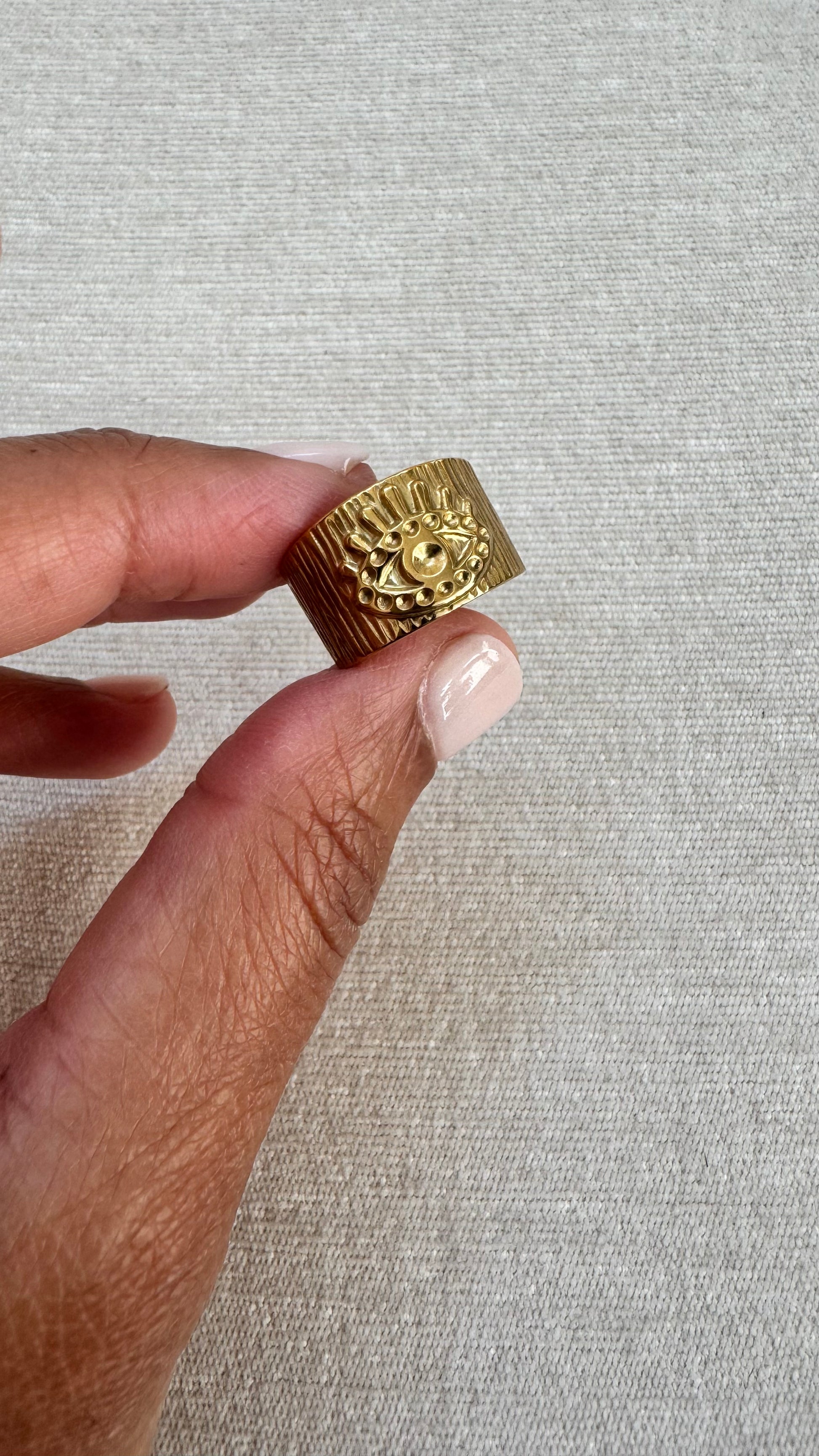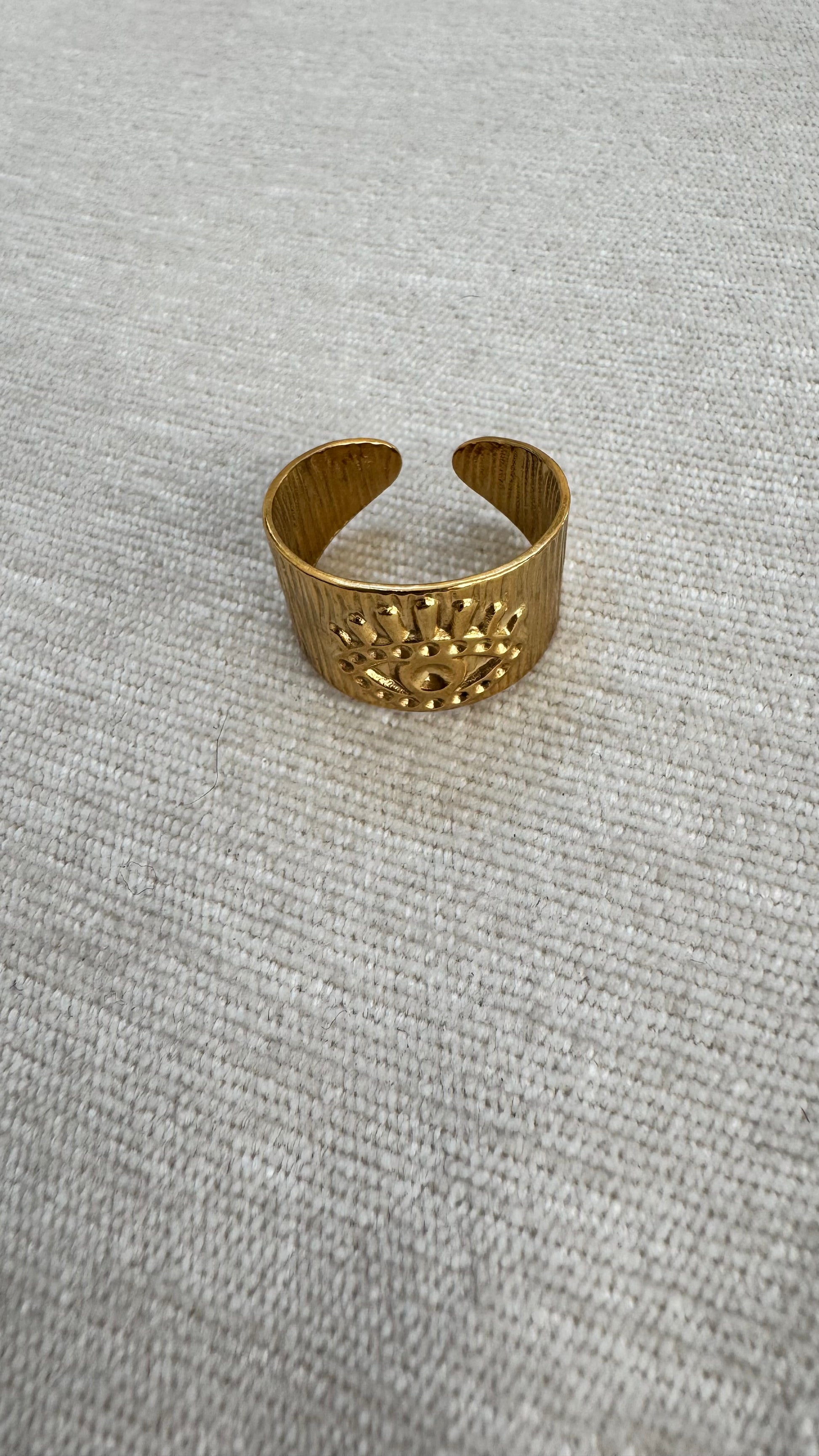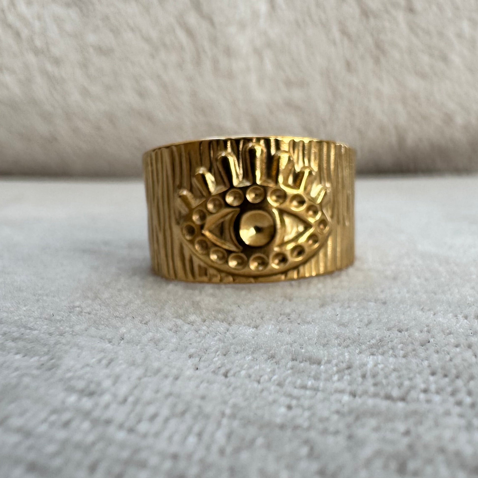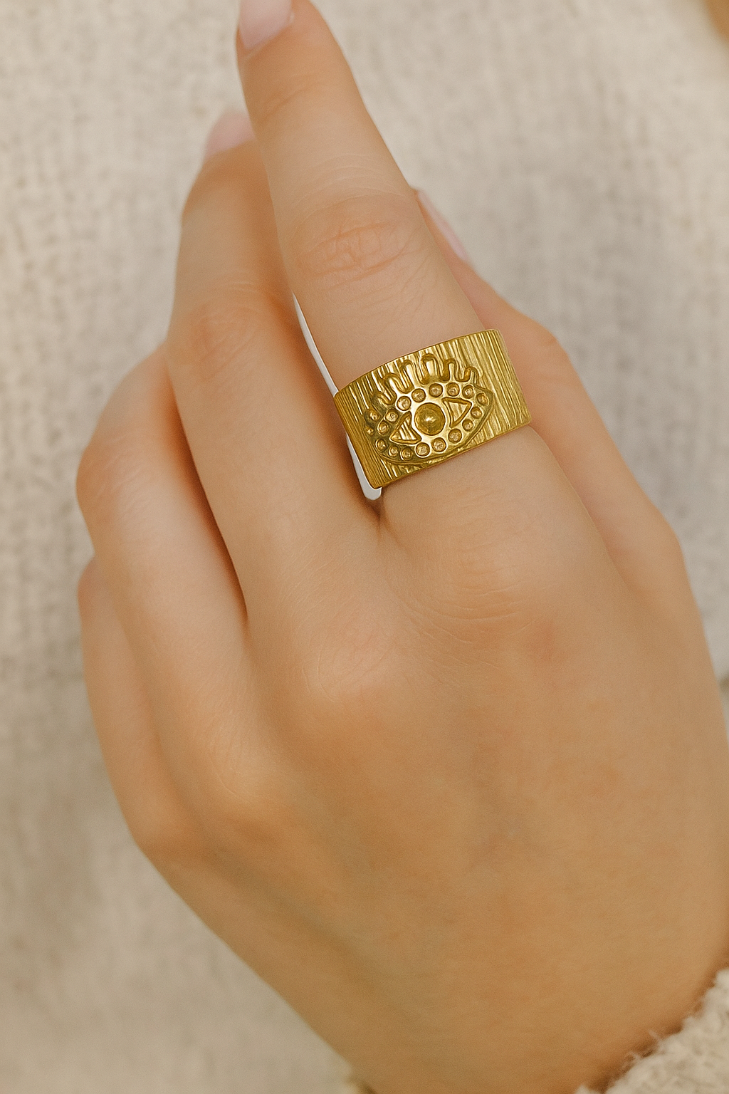Protect your energy in style with our Nazar Ring, a modern take on the timeless evil eye. Crafted in stainless steel, this bold statement ring is adjustable for a perfect fit and designed to be non-tarnish, ensuring it stays golden for years to come.