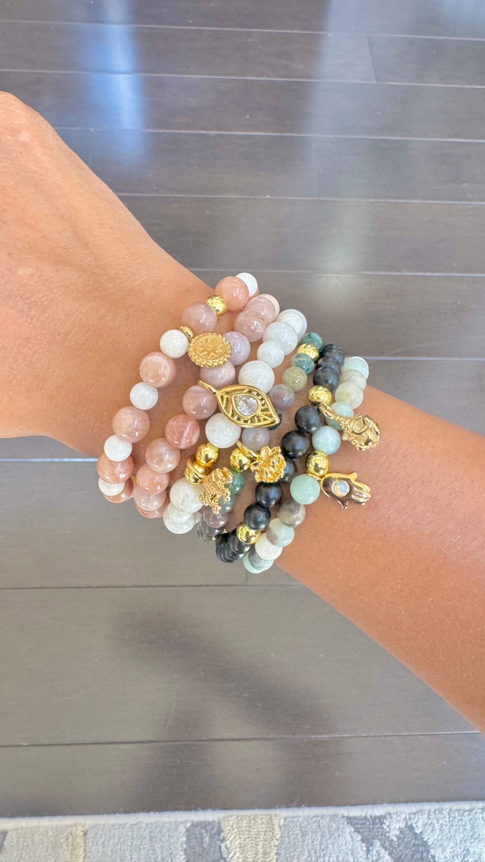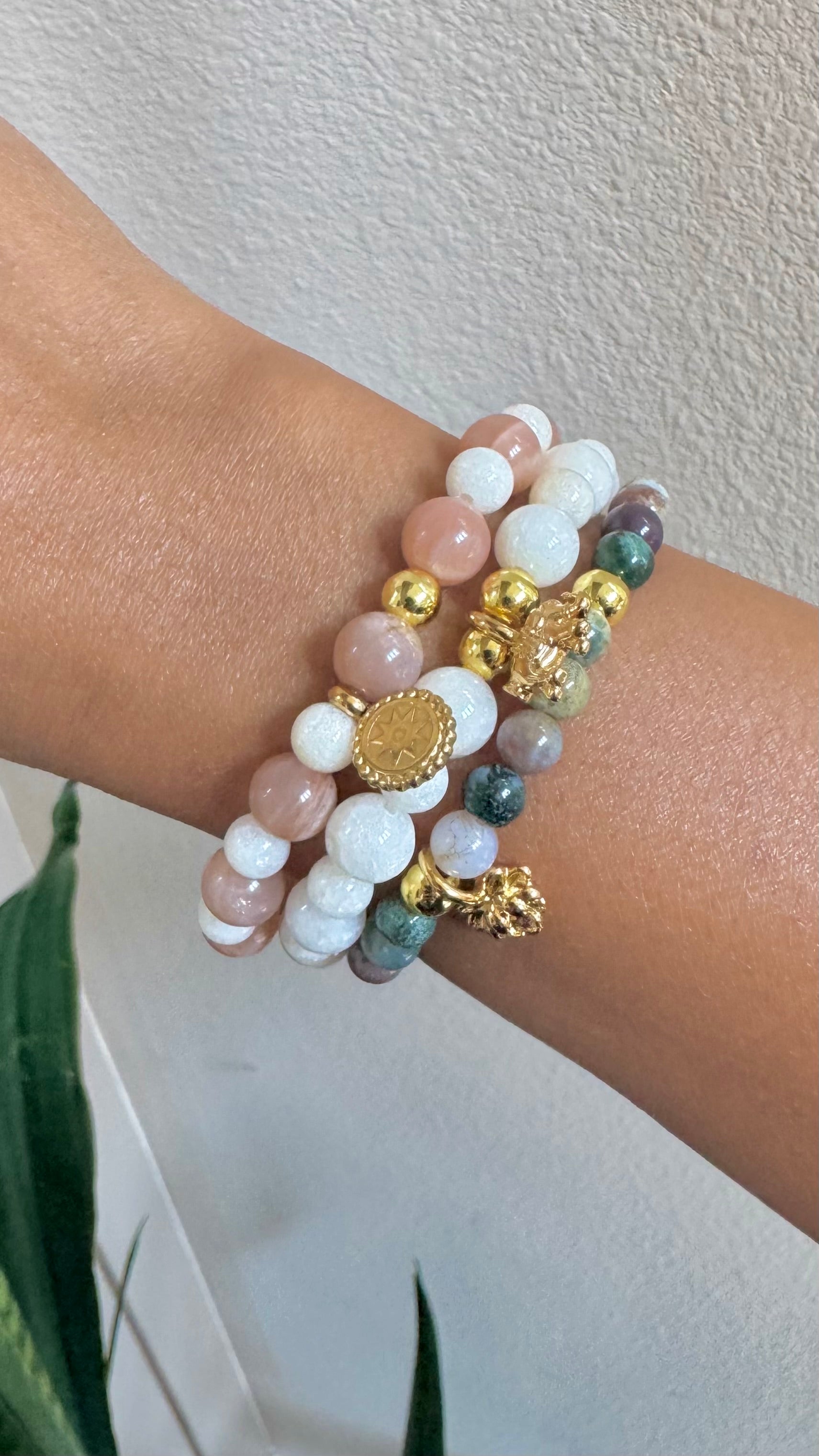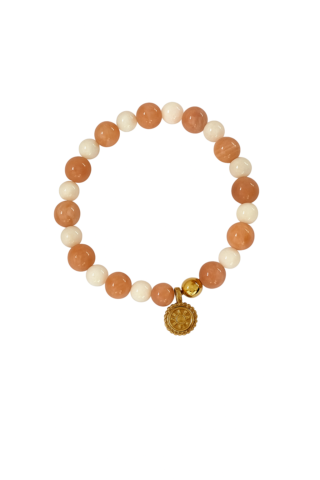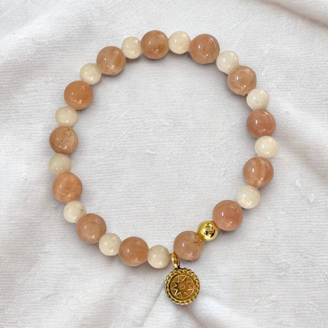 Channel warmth, strength, and vitality with our Sol Energy Bracelet, crafted with plated quartz and Sunstone beads, accented by a stainless steel, non-tarnish gold sun medallion.