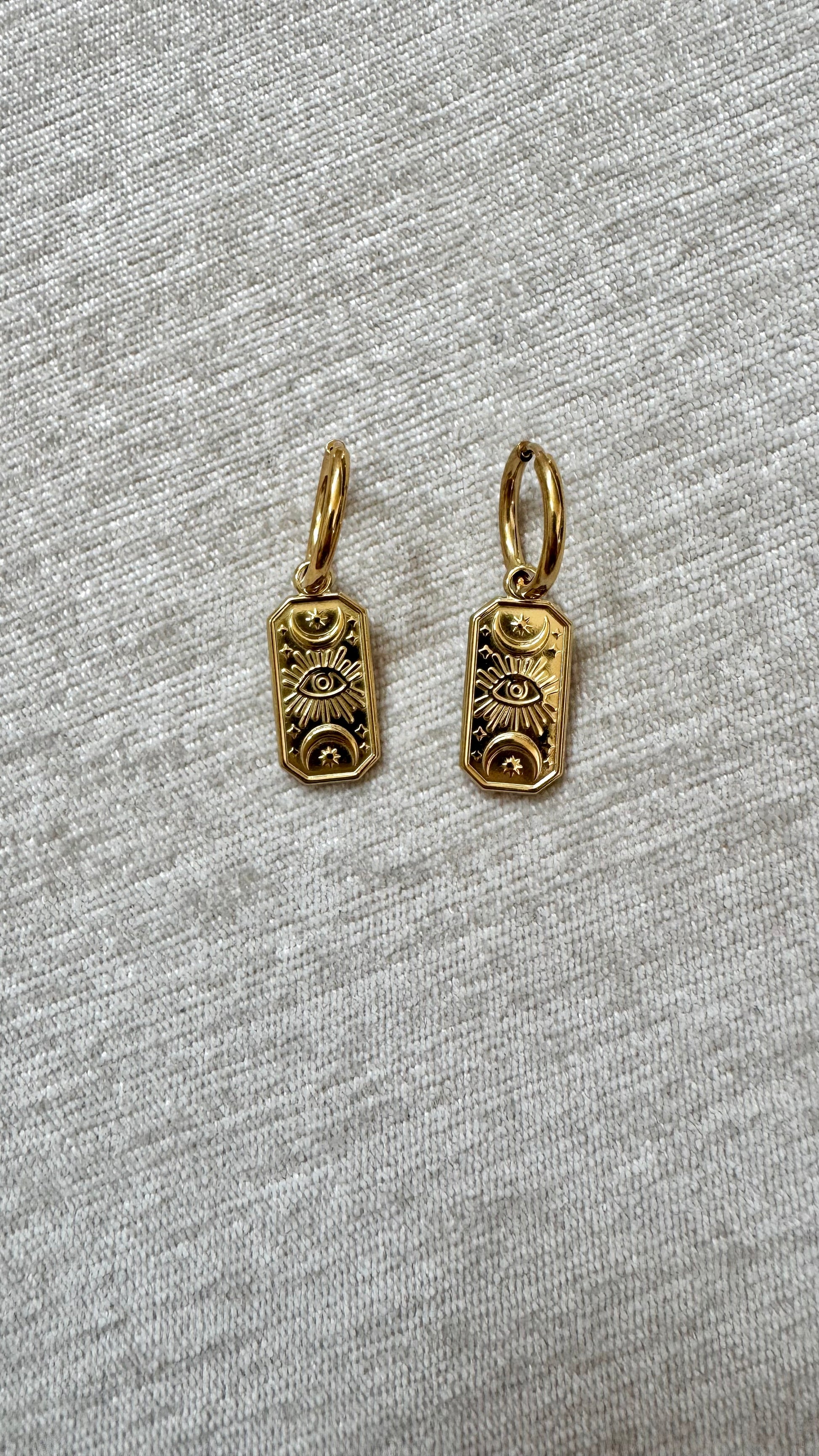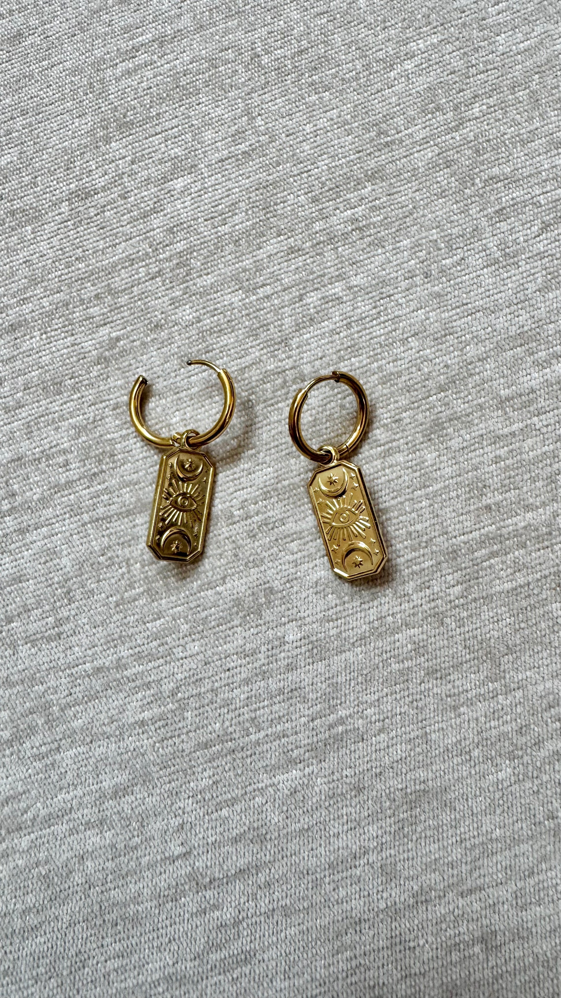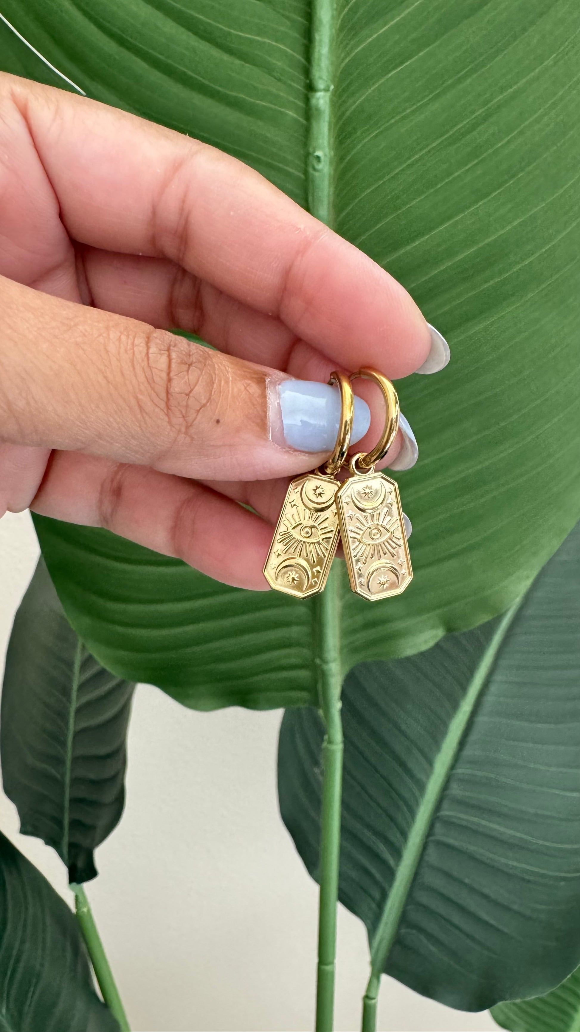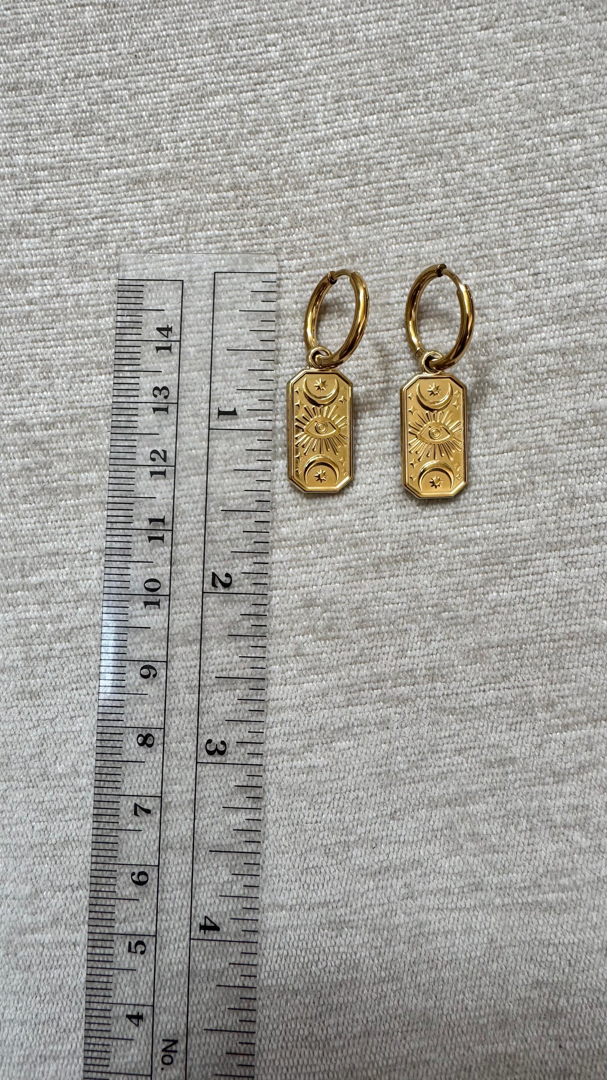 Add a little cosmic charm to your everyday look with these stunning two-in-one huggie earrings. Crafted from shiny, hypoallergenic stainless steel, these gold huggies feature a unique rectangular shape and a beautiful trio of sun, moon, and evil eye charms — all symbolic and stylish.
