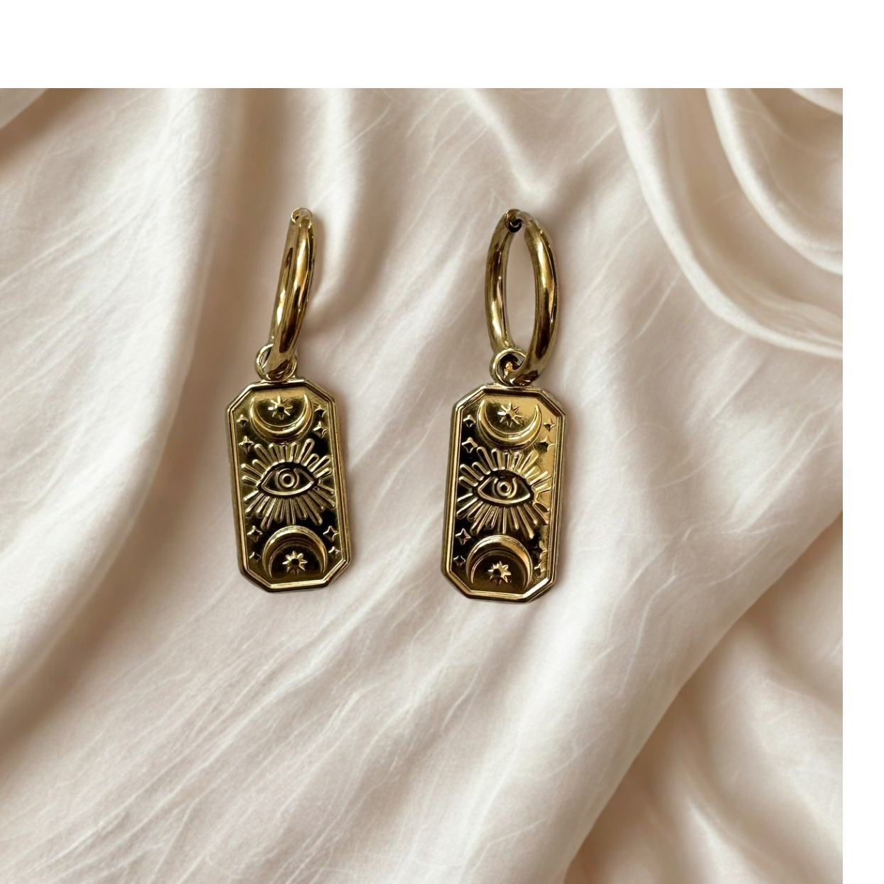 Lightweight and comfortable, these earrings are gentle on sensitive ears and perfect for all-day wear. The evil eye offers protection, the sun brings warmth and positivity, and the moon symbolizes intuition — making these earrings a meaningful addition to your collection or a thoughtful gift.
