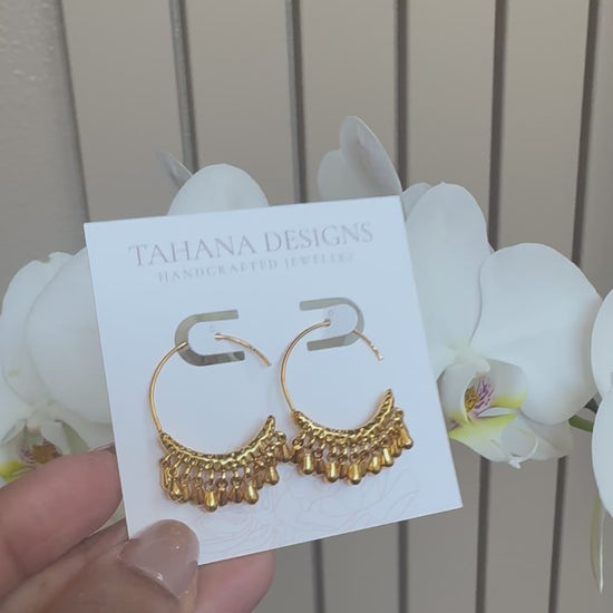 These gold jhumka-inspired hoop earrings are the perfect blend of traditional Indian style and modern elegance. Designed with delicate dangling details, they have beautiful movement that catches the light with every turn, so shiny, so eye-catching, and effortlessly chic.